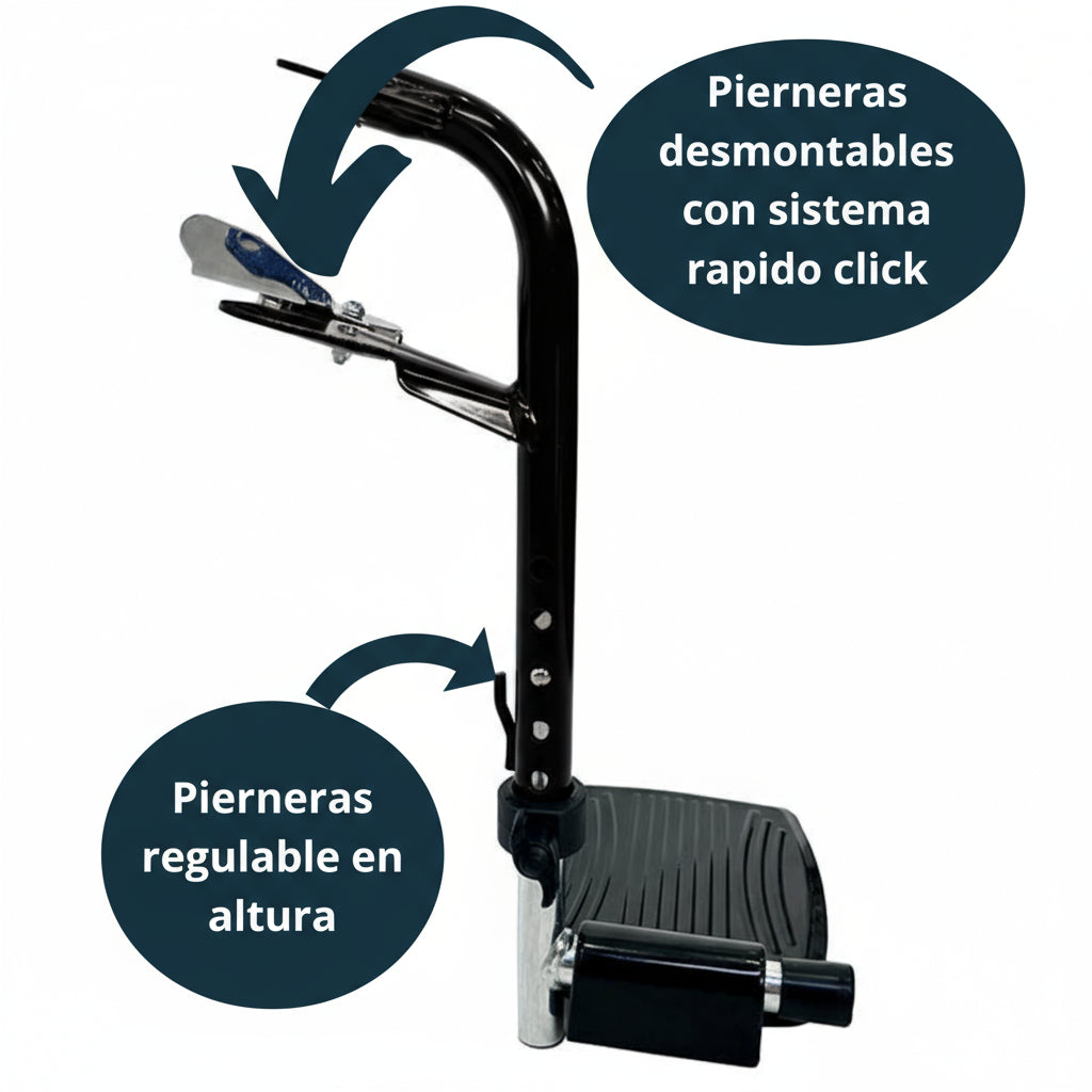 Las pierneras desmontables con sistema de ajuste rápido click permiten personalizar la altura de manera instantánea sin herramientas. Esta versatilidad se adapta perfectamente a diferentes usuarios, condiciones médicas cambiantes, y facilita el acceso en espacios reducidos, optimizando la comodidad y funcionalidad en cada uso.