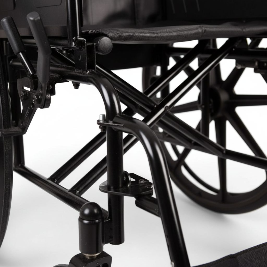 Los brazos completamente abatibles permiten transferencias laterales directas desde camas, asientos de automóvil o sillas convencionales. Esta característica reduce significativamente el riesgo de caídas durante las transferencias y disminuye el esfuerzo físico tanto para el usuario como para el cuidador, especialmente importante en usuarios con movilidad limitada en extremidades inferiores.